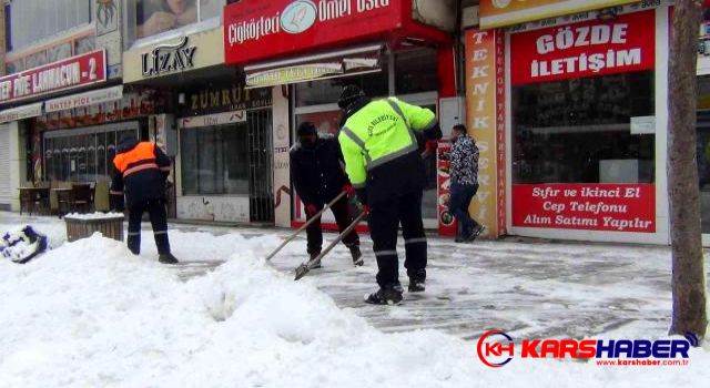 Kars'ta kar yağışı belediye ekiplerini seferber etti. Kentte kaldırımlarda biriken kar, belediye ekipleri ve işyeri sahiplerince temizleniyor. Yol kenarına yığılan karlar ise kamyonlarla kent dışına çıkarılıyor.