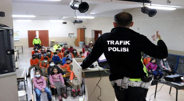 Kars İl Emniyet Müdürlüğü Sarıkamış Trafik Tescil Ve Denetleme Büro Amirliği ekipleri tarafından okullarda öğrenciler bilgilendiriliyor.